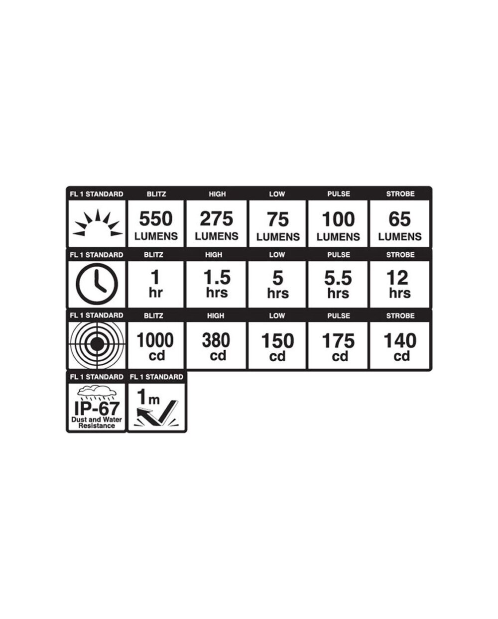 MODUSOK Blitz 550 lumen/1 h, High 275 lumen/1,5 h, Low 75 lumen/5,5 h, Pulse 100 lumen/5,5 h, Strobe 65 lumen/12 h