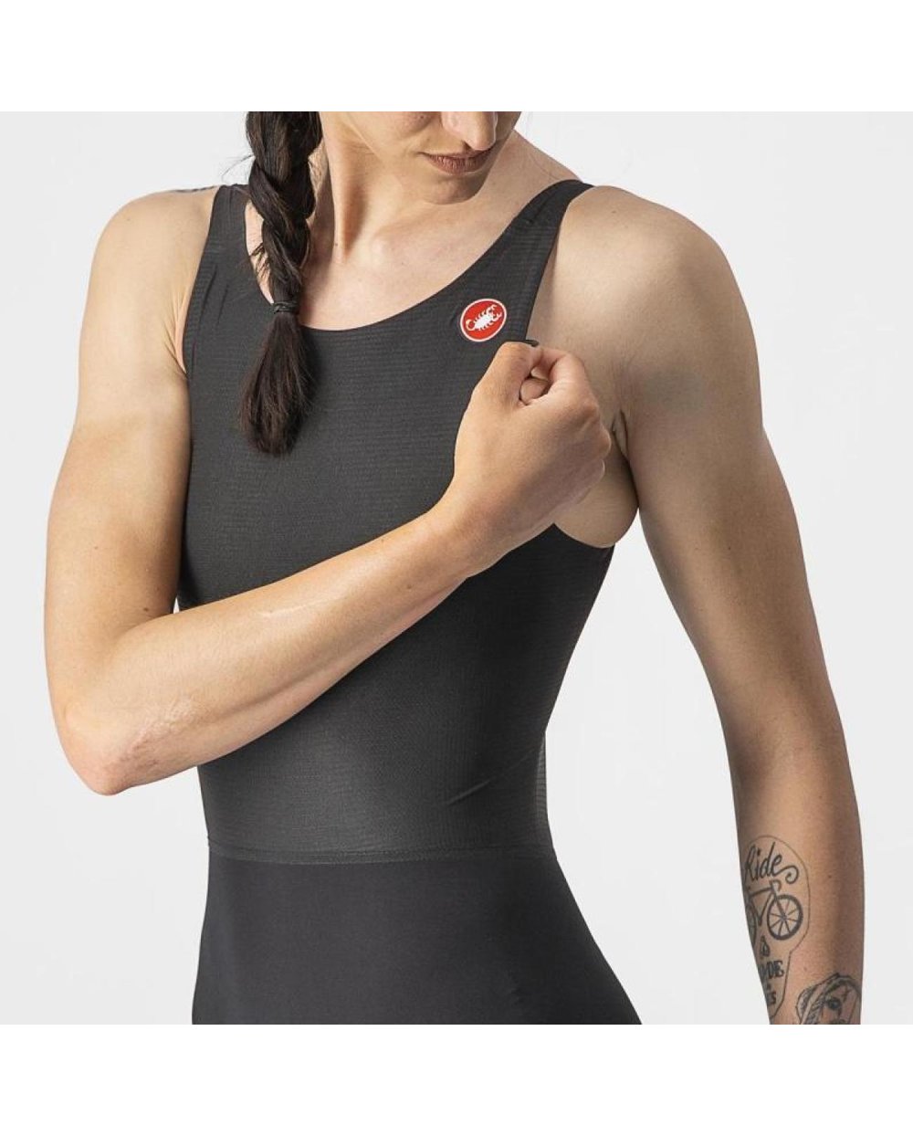 A Német Triatlon Szövetség (DTU) belső tesztjei szerint ez a leggyorsabb fürdőruha, amit valaha teszteltek. A CASTELLI aero sebességet adott hozzá a kerékpározáshoz és a futáshoz, hogy a lehető leggyorsabban érj a célba. A titok a CASTELLI egyedülálló sztreccs anyagában rejlik. Ahelyett, hogy különböző funkciókhoz különböző szöveteket varrnánk össze, valójában az anyag textúráját és teljesítményét variáljuk azokon a területeken, ahol különböző tulajdonságokat kell elérnünk. Ez a legnyilvánvalóbb a lábszár végén, ahol egy gumiszalagot szőttünk az anyag belsejébe, hogy a nadrágot a helyén tartsa, míg a lábszár többi része sima a vízben való gyorsaság érdekében. Ez a technika lehetővé teszi, hogy az alsó rész egyetlen darab szövetből készüljön. És a szélcsatornás kerékpáros tesztben is a leggyorsabbak között volt. A DTU versenyzői azonban futás közben is extra hűtést szerettek volna a felsőtestre, ezért a mellkason és a háton egy másik anyag található, amely hűvösebb marad és elvezeti a nedvességet. Ezt a ruházatot tiszta sebességre fejlesztették ki, és bármilyen sportágban alkalmas.